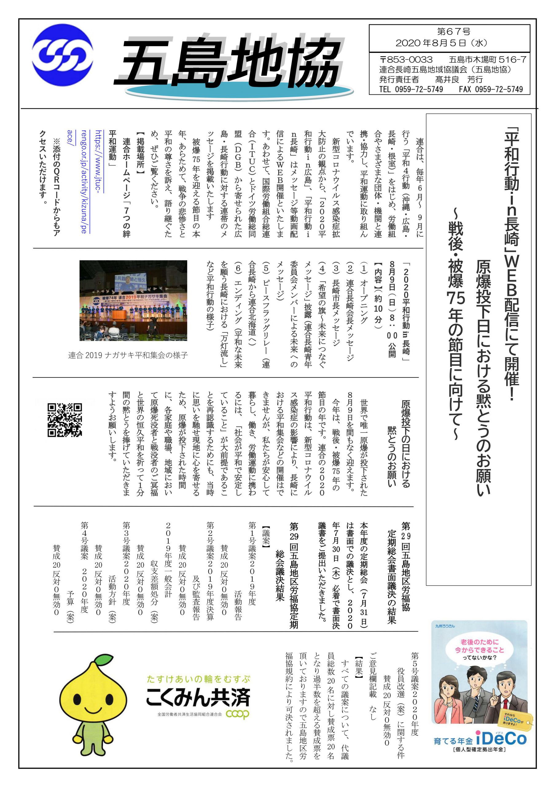 五島地協ニュースが発行されました。平和行動in長崎の取り組みと五島地区労福協総会について掲載されています。