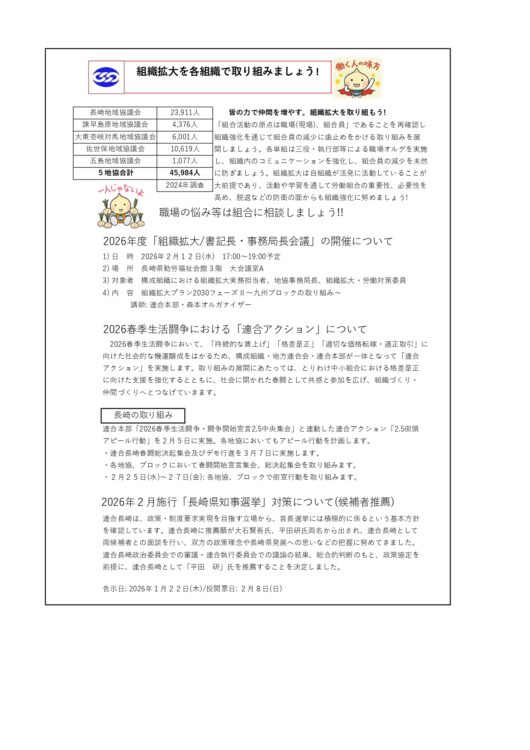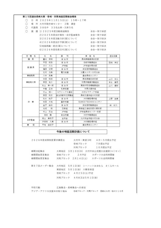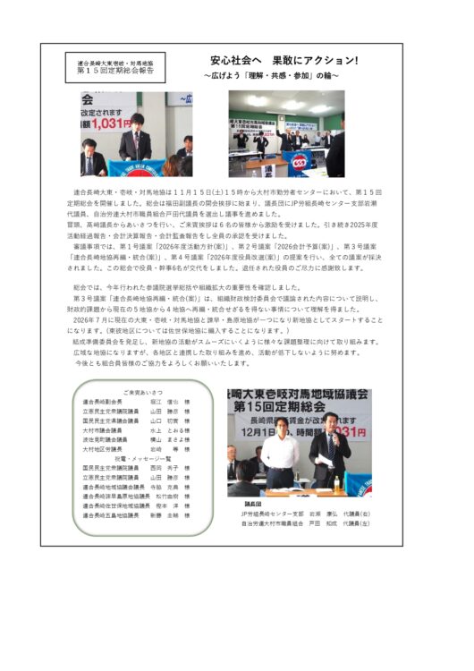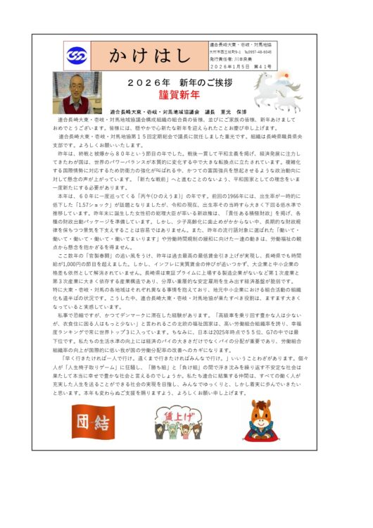 大東・壱岐・対馬地協ニュース「かけはし」第41号(新年号)が発行されました。大東・壱岐・対馬地協 重光議長新年あいさつ、大東・壱岐・対馬地協第15回定期総会、組織拡大の取り組みについて掲載されています。